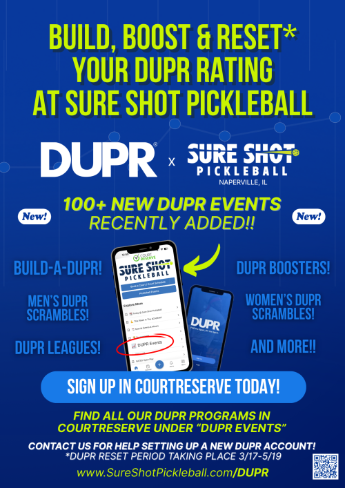 Below you will find a full list of all our upcoming DUPR Events taking place at Sure Shot Pickleball. All of these programs can also be found in CourtReserve under “DUPR Events“