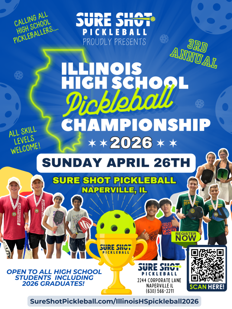 Join us at Sure Shot Pickleball in Naperville, IL for the 3rd Annual ILLINOIS HIGH SCHOOL PICKLEBALL CHAMPIONSHIP! Open to all high school level players (including 2026 graduates). Each doubles team player must attend the SAME high school to participate! See below for details. Contact info@sureshotpickleball.com with any questions!